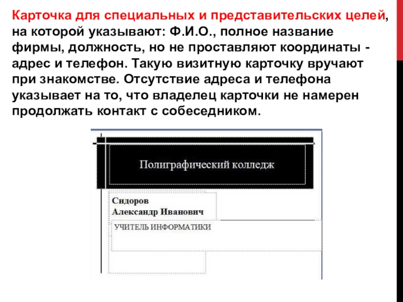 Слайд 5Карточка для специальных и представительских целей, на которой указывают: Ф.И.О., полное