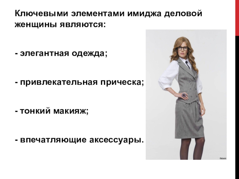 Слайд 20Ключевыми элементами имиджа деловой женщины являются: