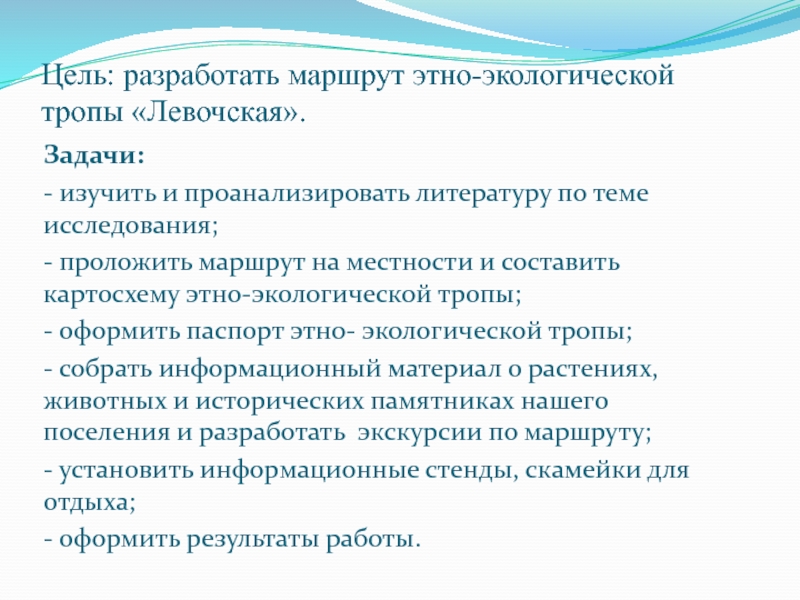 Слайд 3Цель: разработать маршрут этно-экологической тропы «Левочская».