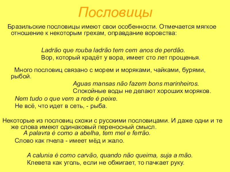 Бразильские пословицы имеют свои особенности. Отмечается мягкое отношение