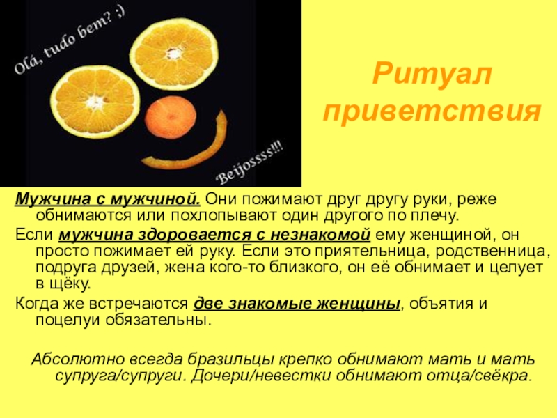 Абсолютно всегда бразильцы крепко обнимают мать и мать супруга/супруги. Дочери/невестки обнимают отца/свёкра.