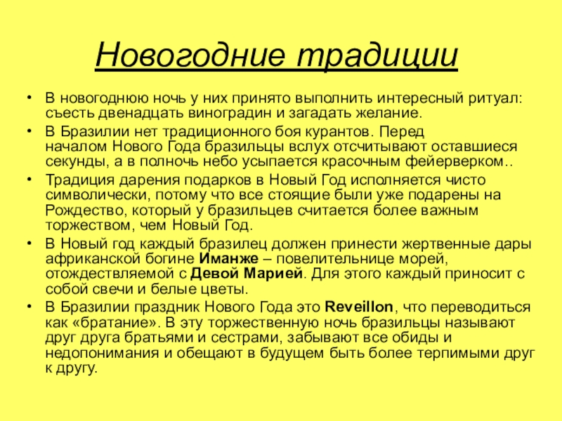 В Бразилии праздник Нового Года это Reveillon, что переводиться как «братание». В эту торжественную ночь бразильцы называют друг друга братьями и сестрами, забывают все обиды и недопонимания и обещают в будущем быть более терпимыми друг к другу.