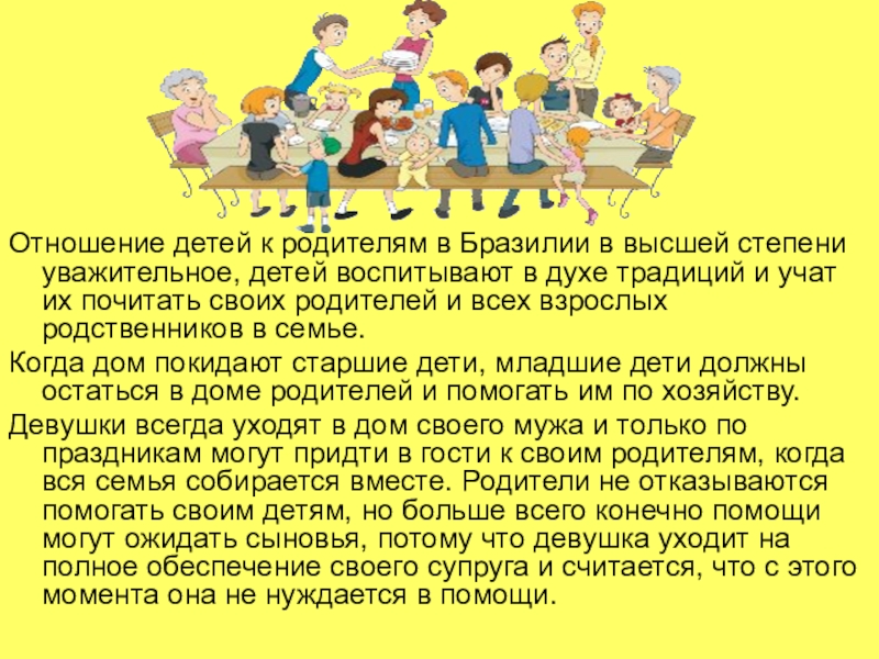 Слайд 5Отношение детей к родителям в Бразилии в высшей степени уважительное, детей