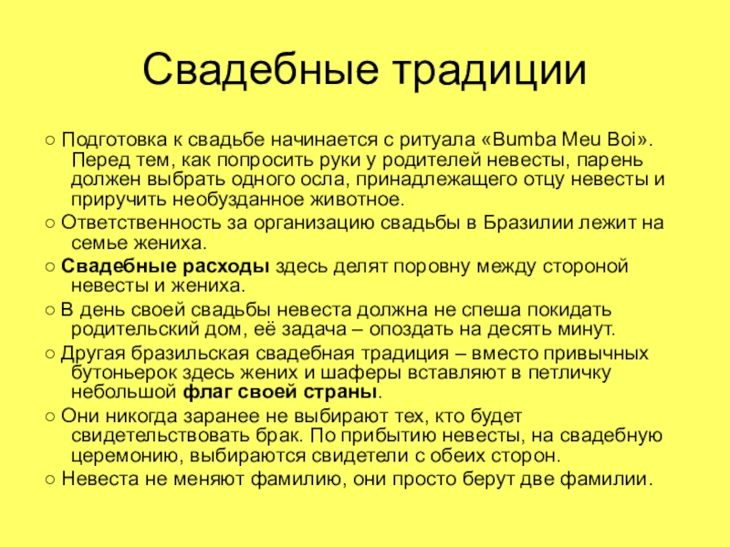 ○ Ответственность за организацию свадьбы в Бразилии лежит на семье жениха.