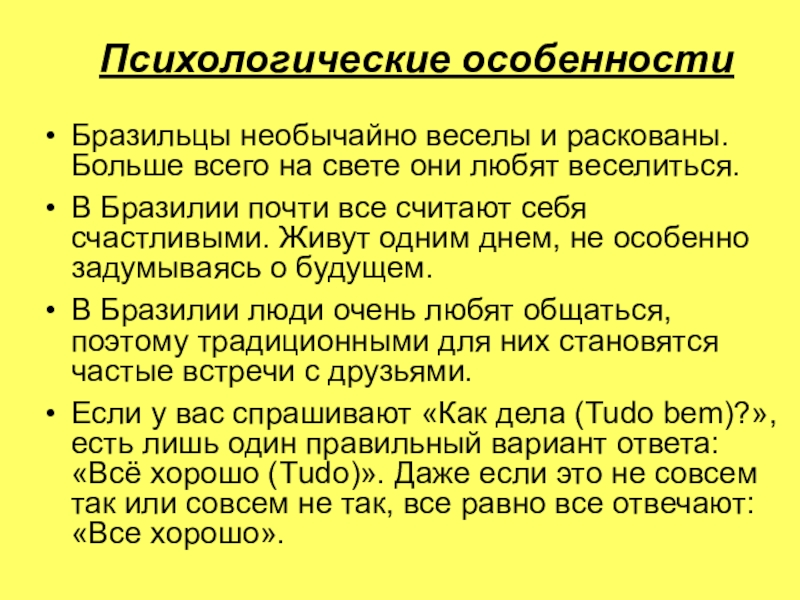 не говорят друг другу "нет" прямо в лоб. Ведь для них отказать — это все равно что сказать: "Ты мне не интересен", "Я не хочу тебе помогать", "Я не хочу тебя видеть". Поэтому многие бразильцы предпочитают сначала согласиться, а потом сослаться на обстоятельства, которые им помешали.