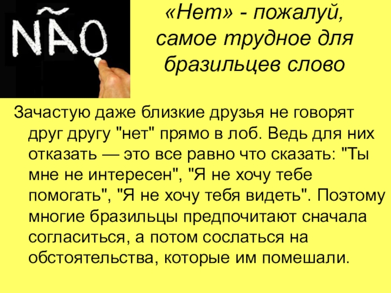 Слайд 10«Нет» - пожалуй, самое трудное для бразильцев слово