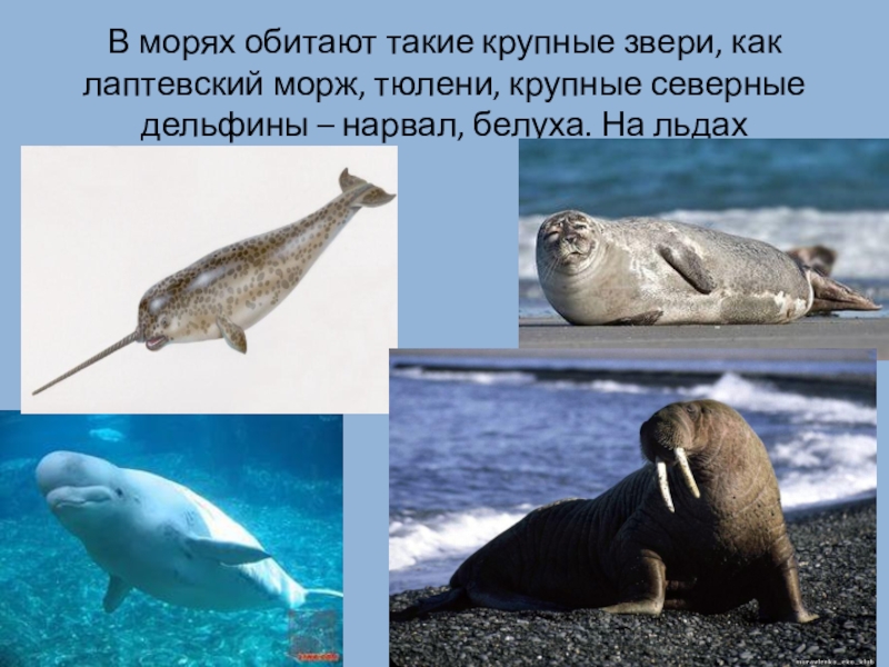 Слайд 19В морях обитают такие крупные звери, как лаптевский морж, тюлени, крупные