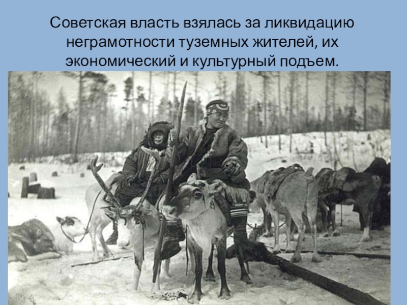 Слайд 27Советская власть взялась за ликвидацию неграмотности туземных жителей, их экономический и
