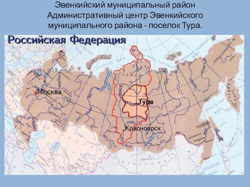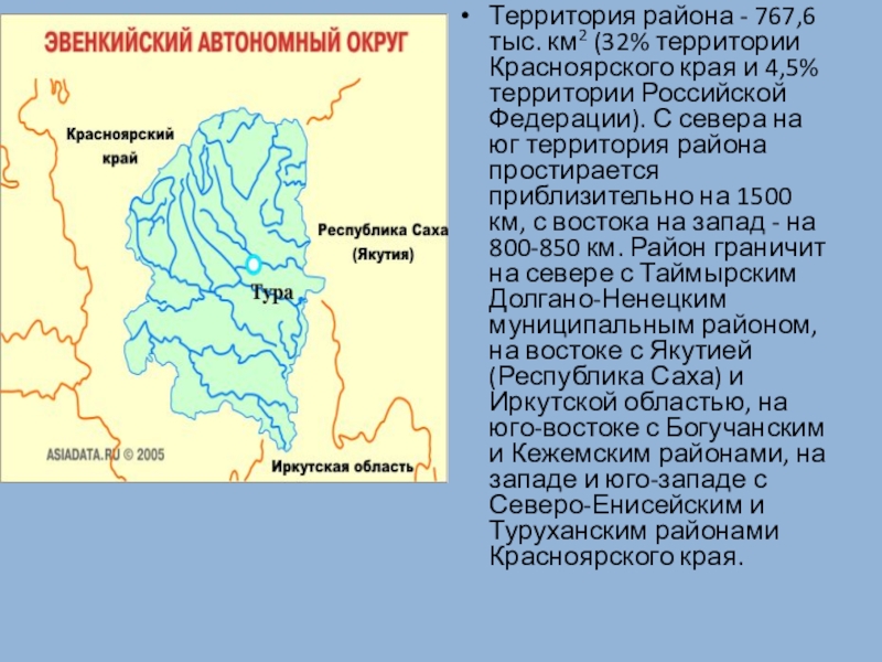 территории Российской Федерации). С севера на юг территория района простирается приблизительно на 1500 км, с востока на запад - на 800-850 км. Район граничит на севере с Таймырским Долгано-Ненецким муниципальным районом, на востоке с Якутией (Республика Саха) и Иркутской областью, на юго-востоке с Богучанским и Кежемским районами, на западе и юго-западе с Северо-Енисейским и Туруханским районами Красноярского края.