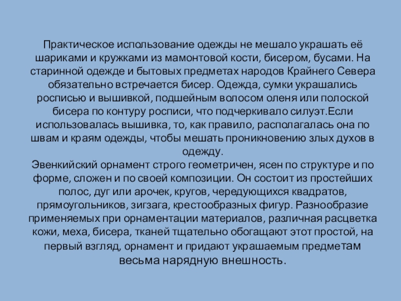 мамонтовой кости, бисером, бусами. На старинной одежде и бытовых предметах народов Крайнего Севера обязательно встречается бисер. Одежда, сумки украшались росписью и вышивкой, подшейным волосом оленя или полоской бисера по контуру росписи, что подчеркивало силуэт.Если использовалась вышивка, то, как правило, располагалась она по швам и краям одежды, чтобы мешать проникновению злых духов в одежду.