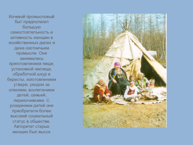 делах и даже охотничьем промысле. Они занимались приготовлением пищи, установкой жилища, обработкой шкур и бересты, изготовлением утвари, уходом за оленями, воспитанием детей, семьей, перекочевками. С рождением детей они приобретали более высокий социальный статус в обществе.