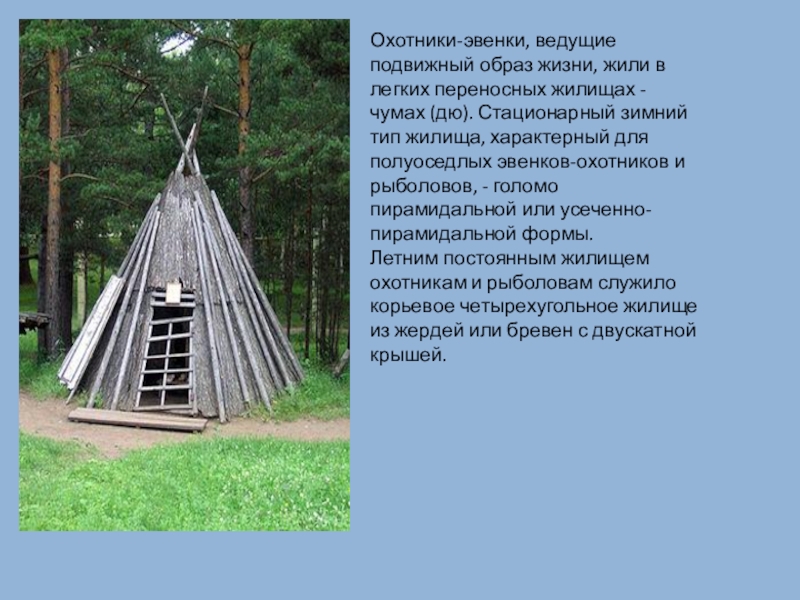 Охотники-эвенки, ведущие подвижный образ жизни, жили в легких переносных жилищах -