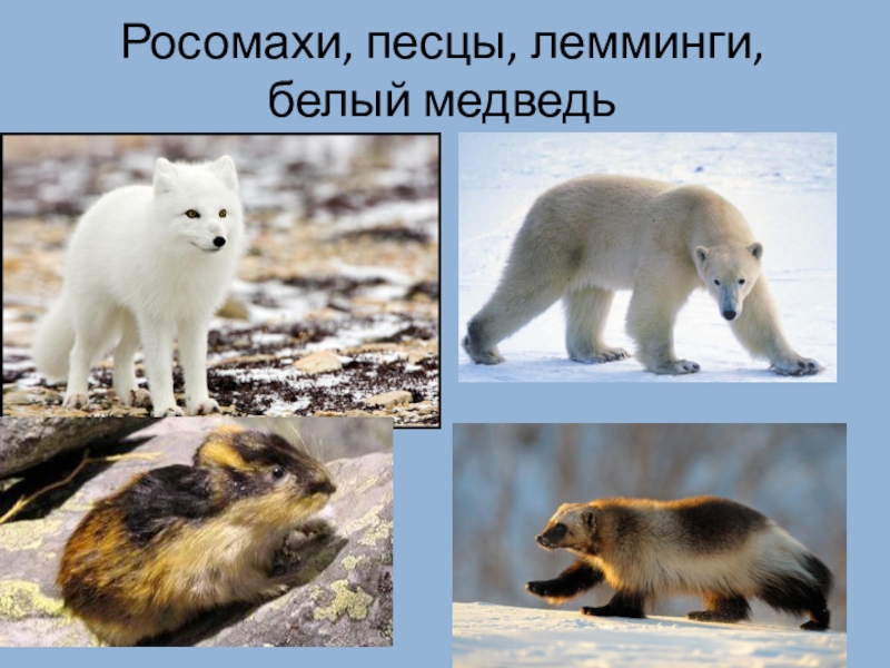 Слайд 20Росомахи, песцы, лемминги, белый медведь