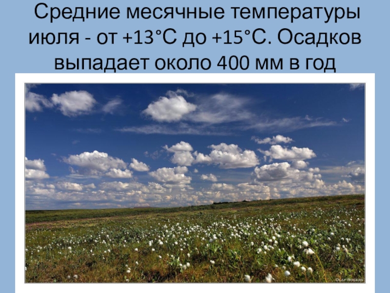 Слайд 10 Средние месячные температуры июля - от +13°С до +15°С. Осадков выпадает