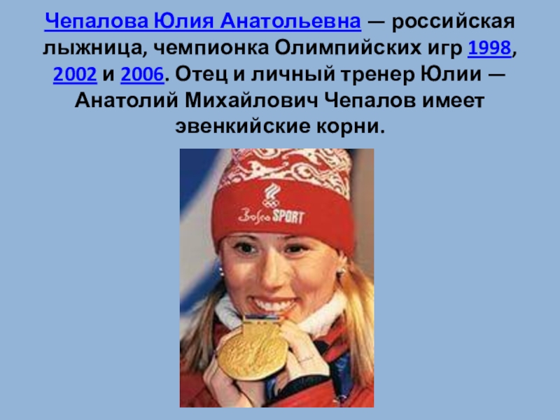 Слайд 44Чепалова Юлия Анатольевна — российская лыжница, чемпионка Олимпийских игр 1998, 2002