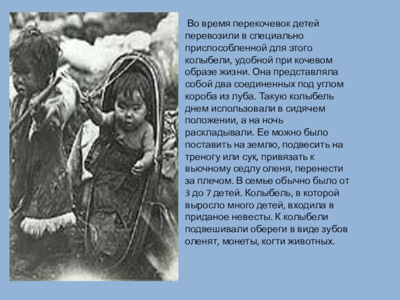 Слайд 37 Во время перекочевок детей перевозили в специально приспособленной для этого