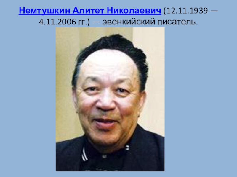 Слайд 46Немтушкин Алитет Николаевич (12.11.1939 — 4.11.2006 гг.) — эвенкийский писатель.