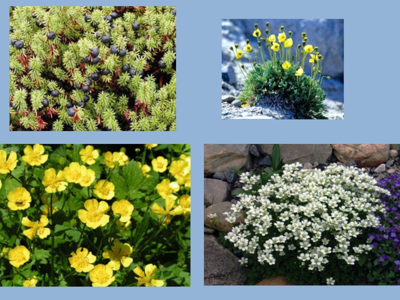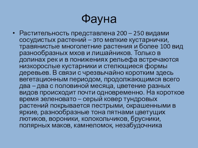 кустарнички, травянистые многолетние растения и более 100 вид разнообразных мхов и лишайников. Только в долинах рек и в понижениях рельефа встречаются низкорослые кустарники и стелющиеся формы деревьев. В связи с чрезвычайно коротким здесь вегетационным периодом, продолжающимся всего два – два с половиной месяца, цветение разных видов происходит почти одновременно. На короткое время зеленовато – серый ковер тундровых растений покрывается пестрыми, окрашенными в яркие, разнообразные тона пятнами цветущих лютиков, вороники, колокольчиков, брусники, полярных маков, камнеломок, незабудочника