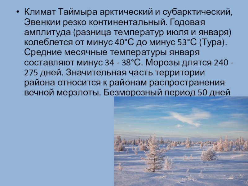 Слайд 9Климат Таймыра арктический и субарктический, Эвенкии резко континентальный. Годовая амплитуда (разница