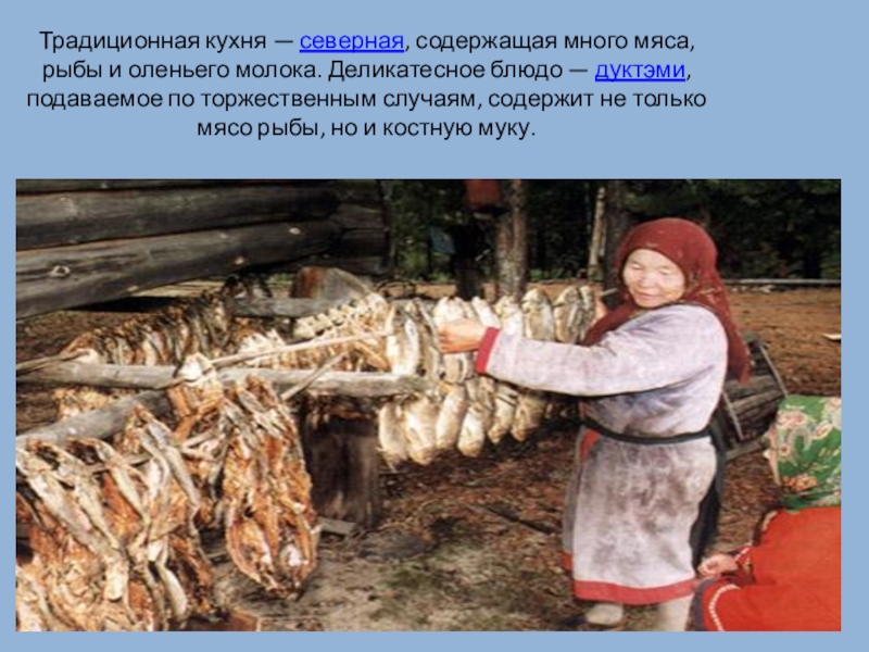 Слайд 40Традиционная кухня — северная, содержащая много мяса, рыбы и оленьего молока. Деликатесное