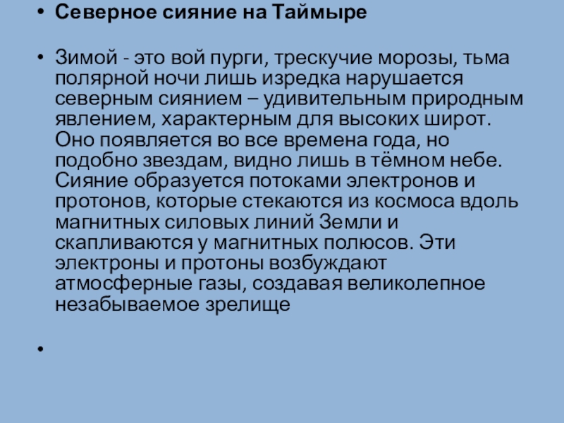полярной ночи лишь изредка нарушается северным сиянием – удивительным природным явлением, характерным для высоких широт. Оно появляется во все времена года, но подобно звездам, видно лишь в тёмном небе. Сияние образуется потоками электронов и протонов, которые стекаются из космоса вдоль магнитных силовых линий Земли и скапливаются у магнитных полюсов. Эти электроны и протоны возбуждают атмосферные газы, создавая великолепное незабываемое зрелище