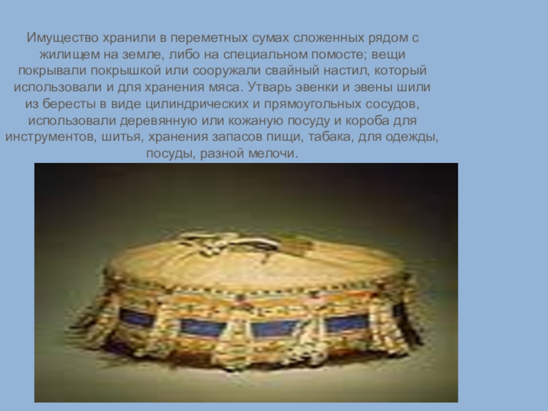 либо на специальном помосте; вещи покрывали покрышкой или сооружали свайный настил, который использовали и для хранения мяса. Утварь эвенки и эвены шили из бересты в виде цилиндрических и прямоугольных сосудов, использовали деревянную или кожаную посуду и короба для инструментов, шитья, хранения запасов пищи, табака, для одежды, посуды, разной мелочи.