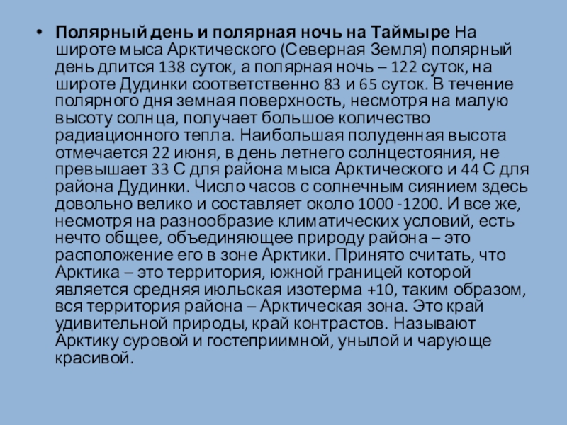 Земля) полярный день длится 138 суток, а полярная ночь – 122 суток, на широте Дудинки соответственно 83 и 65 суток. В течение полярного дня земная поверхность, несмотря на малую высоту солнца, получает большое количество радиационного тепла. Наибольшая полуденная высота отмечается 22 июня, в день летнего солнцестояния, не превышает 33 С для района мыса Арктического и 44 С для района Дудинки. Число часов с солнечным сиянием здесь довольно велико и составляет около 1000 -1200. И все же, несмотря на разнообразие климатических условий, есть нечто общее, объединяющее природу района – это расположение его в зоне Арктики. Принято считать, что Арктика – это территория, южной границей которой является средняя июльская изотерма +10, таким образом, вся территория района – Арктическая зона. Это край удивительной природы, край контрастов. Называют Арктику суровой и гостеприимной, унылой и чарующе красивой.