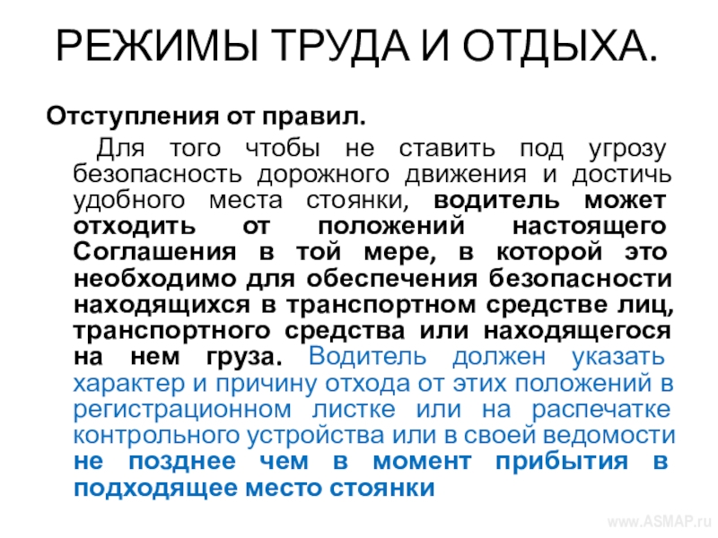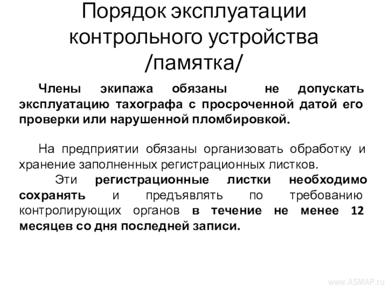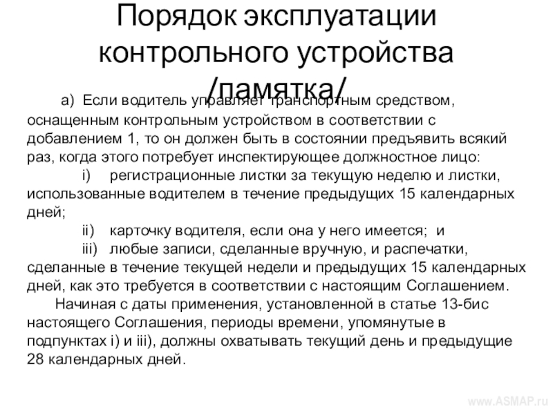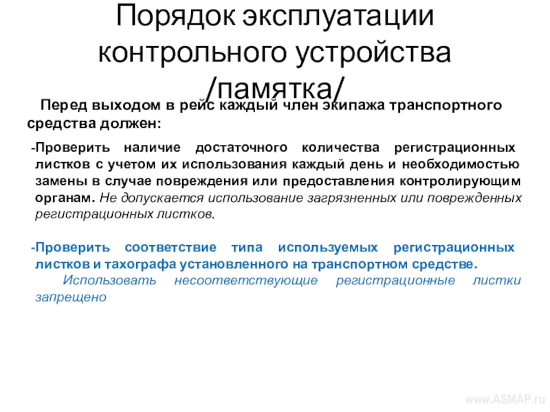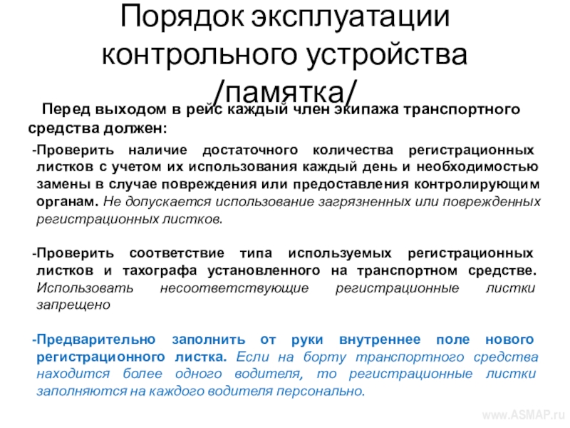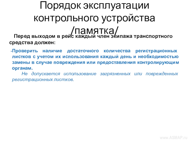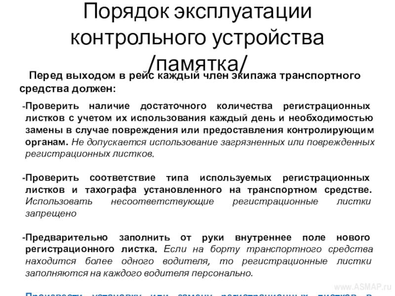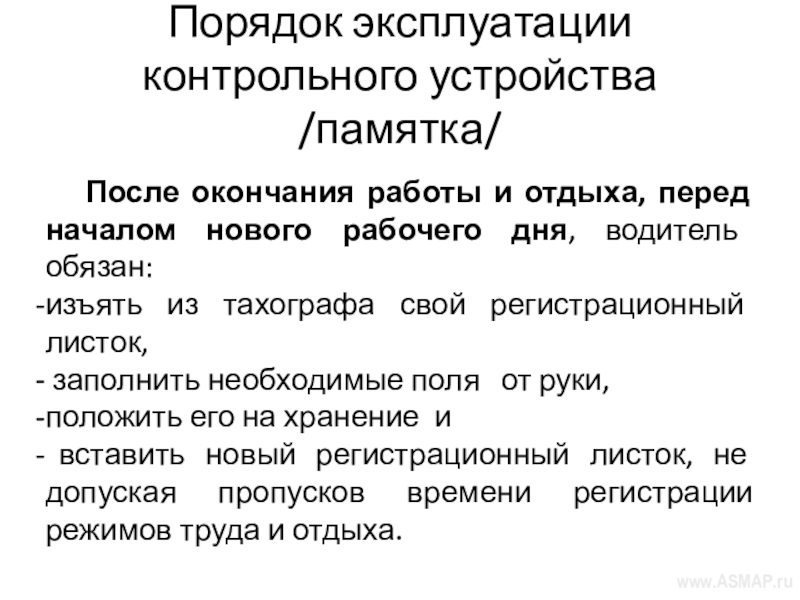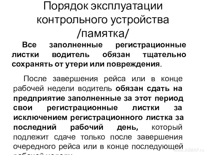 После завершения рейса или в конце рабочей недели водитель обязан сдать на предприятие заполненные за этот период свои регистрационные листки за исключением регистрационного листка за последний рабочий день, который подлежит сдаче только после завершения очередного рейса или в конце последующей рабочей недели.