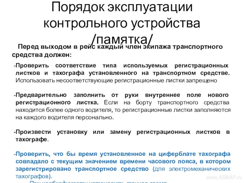 Проверить, что бы время установленное на циферблате тахографа совпадало с текущим значением времени часового пояса, в котором зарегистрировано транспортное средство (для электромеханических тахографов). При необходимости установить точное время.