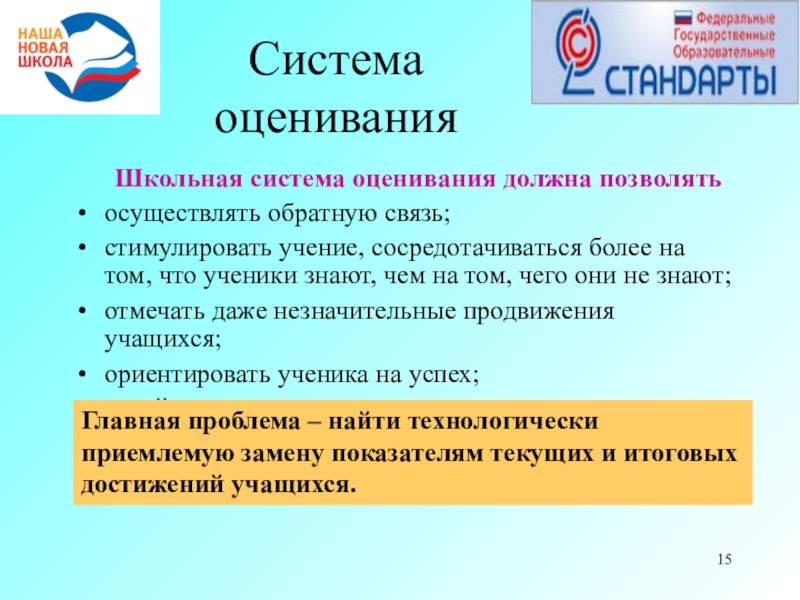 Главная проблема – найти технологически приемлемую замену показателям текущих и итоговых достижений учащихся.