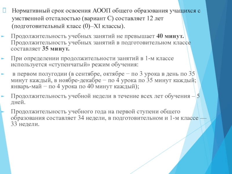 Нормативный срок освоения АООП общего образования учащихся с умственной отсталостью (вариант С) составляет 12 лет (подготовительный класс (0)–XI классы).