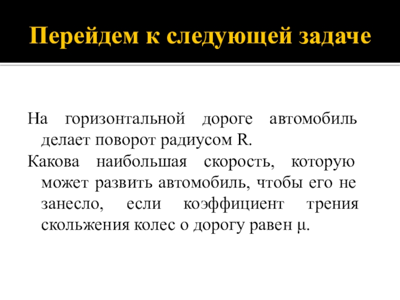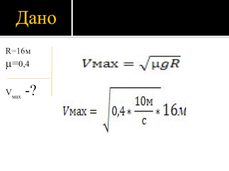 На горизонтальной дороге автомобиль делает поворот радиусом 16 м. Какова наибольшая скорость, которую может развить автомобиль, чтобы его не занесло, если коэффициент трения скольжения колес о дорогу равен 0,4?