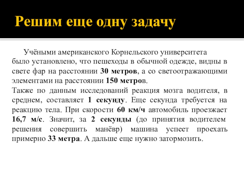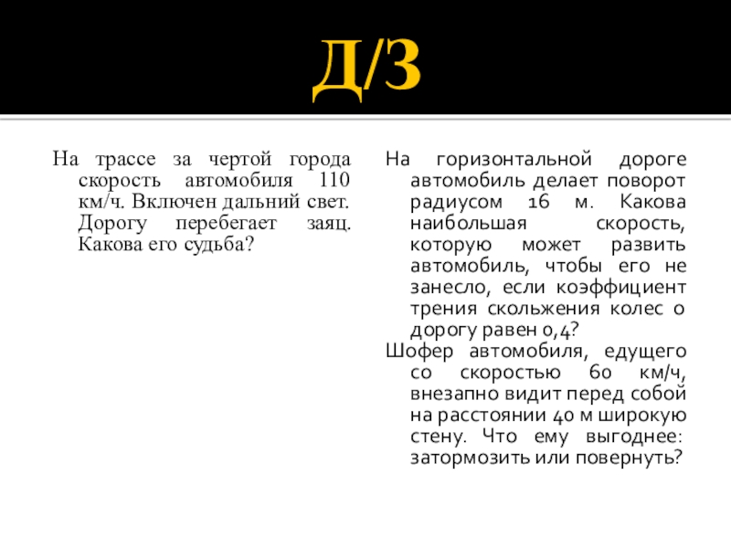 Шофер автомобиля, едущего со скоростью 60 км/ч, внезапно видит перед собой на расстоянии 40 м широкую стену. Что ему выгоднее: затормозить или повернуть?