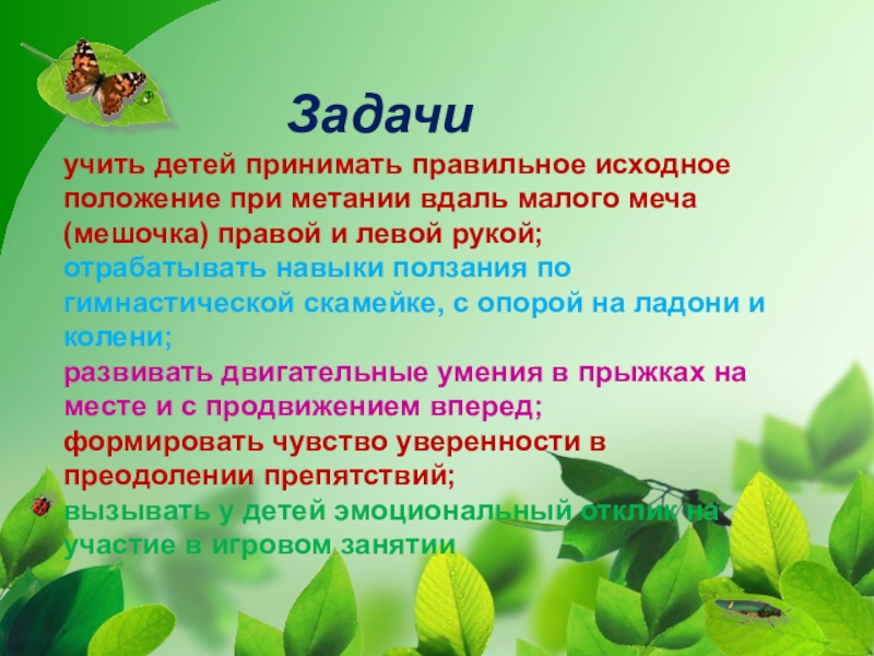 развивать двигательные умения в прыжках на месте и с продвижением вперед;
