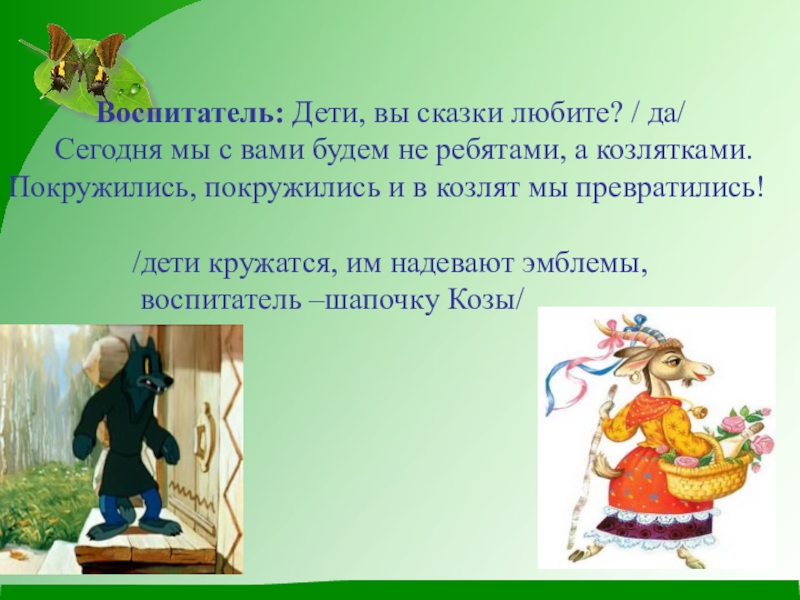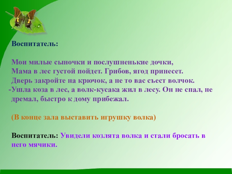 Воспитатель: Мама накормила козлят и опять ушла в лес, а волк опять тут как тут.
