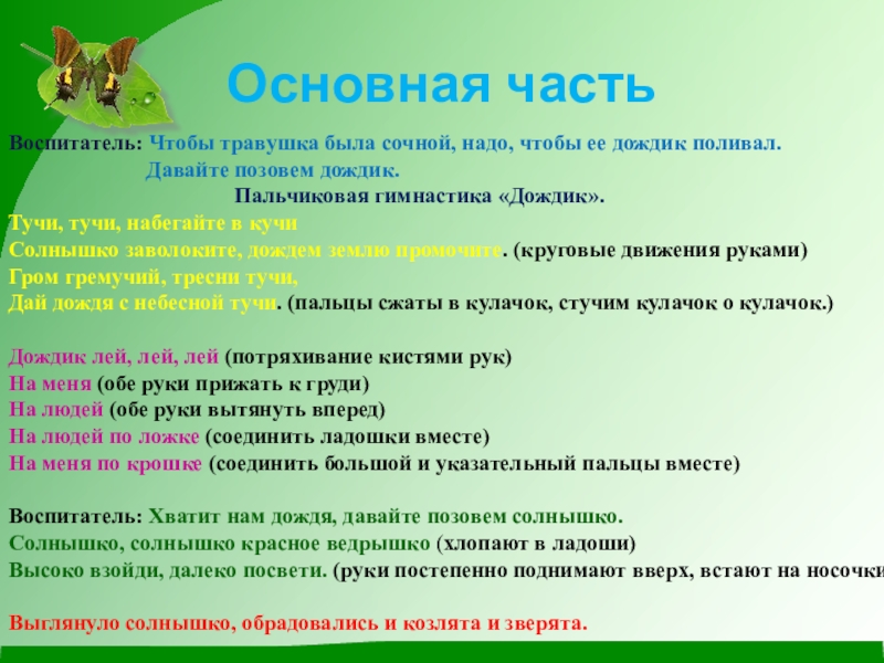 Воспитатель: Чтобы травушка была сочной, надо, чтобы ее дождик поливал.
