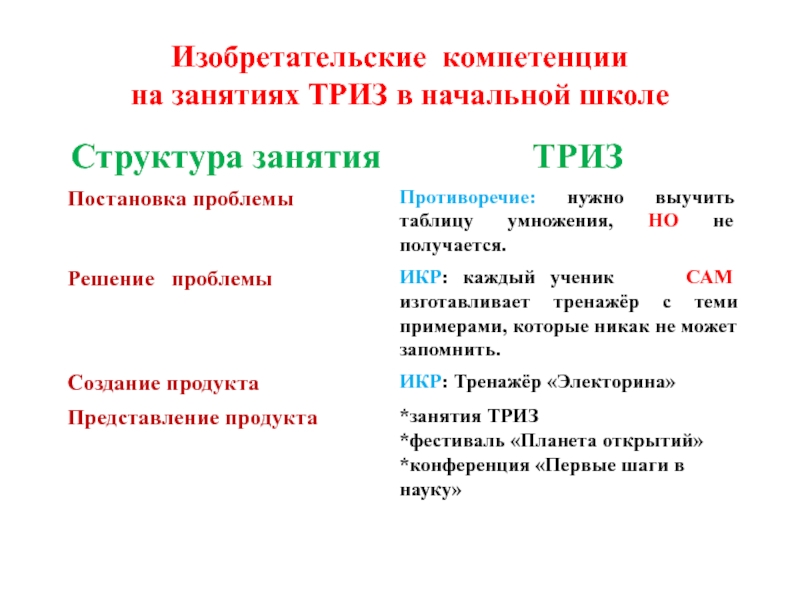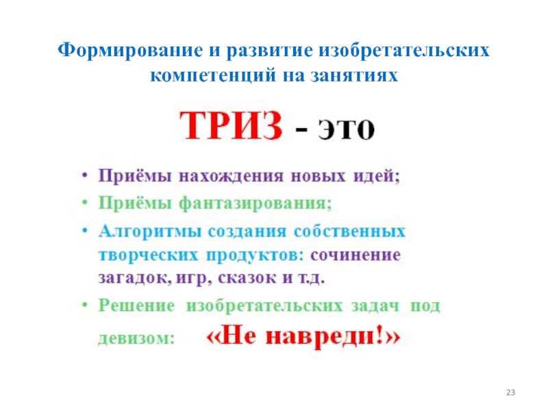 Приёмы разрешения противоречий: «Инверсия», «Фазовый переход», «Переход в другое состояние», «Заранее подложенной подушки», Матрёшка», «Проскока», «Обратить вред в пользу».