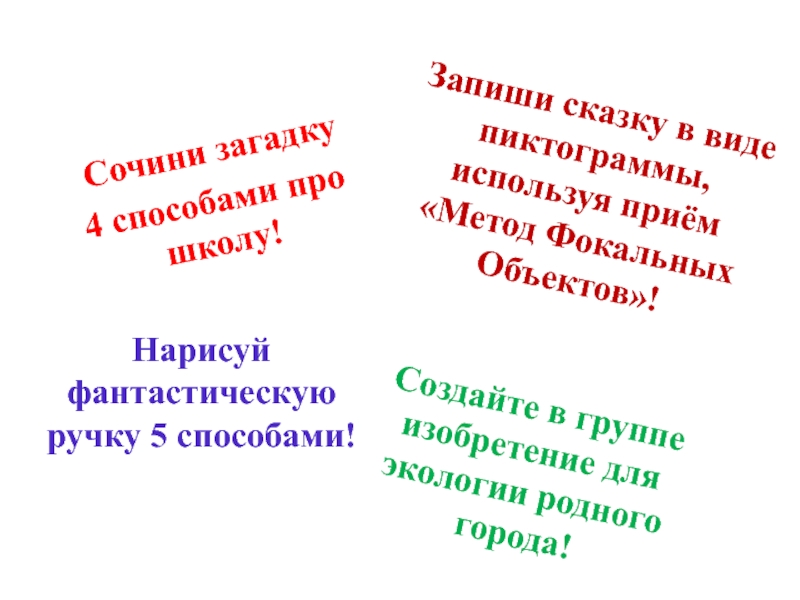 изобразительная деятельность: приёмы «Оживление», «Наоборот», «Увеличить – Уменьшить», «Универсализирование», «Раздробление – Объединение», «Изменение закона природы», «Внести внутрь - Вынести наружу»…