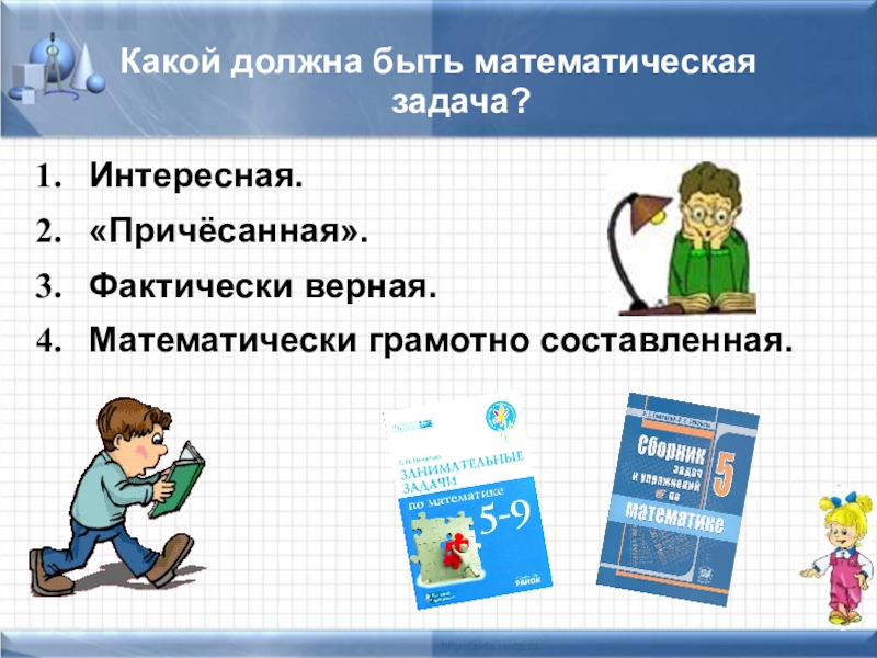 Текстовая задача имеет много важных свойств и предназначений, но в первую очередь она является для ученика настоящим, хоть и маленьким научным исследованием. Незначительная часть задач, предлагаемых учащимся, соответствует данному требованию.