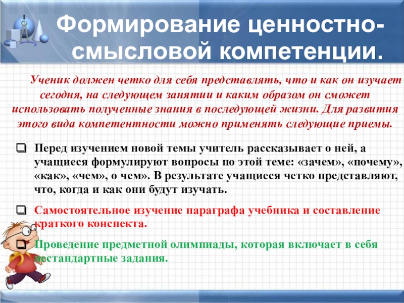 Ученик должен четко для себя представлять, что и как он изучает сегодня, на следующем занятии и каким образом он сможет использовать полученные знания в последующей жизни. Для развития этого вида компетентности можно применять следующие приемы.
