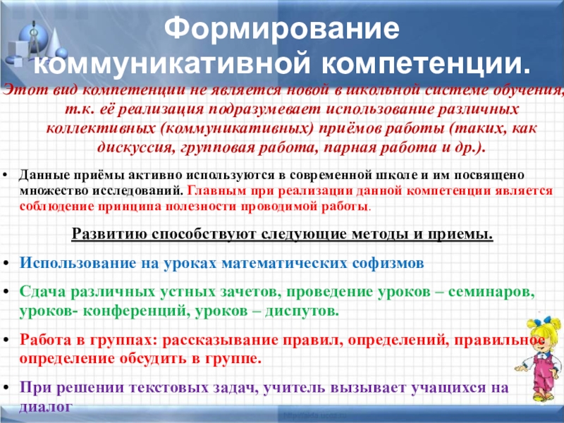 Данные приёмы активно используются в современной школе и им посвящено множество исследований. Главным при реализации данной компетенции является соблюдение принципа полезности проводимой работы.