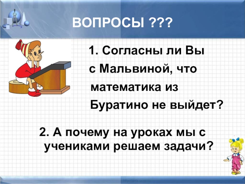 При решении текстовых задач, учитель вызывает учащихся на диалог