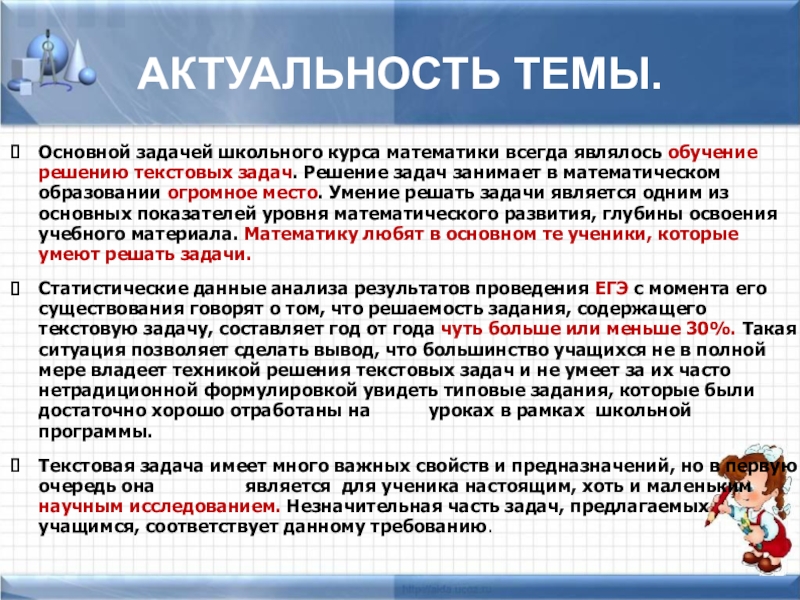 Основной задачей школьного курса математики всегда являлось обучение решению текстовых