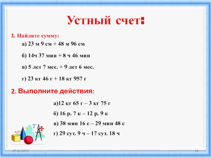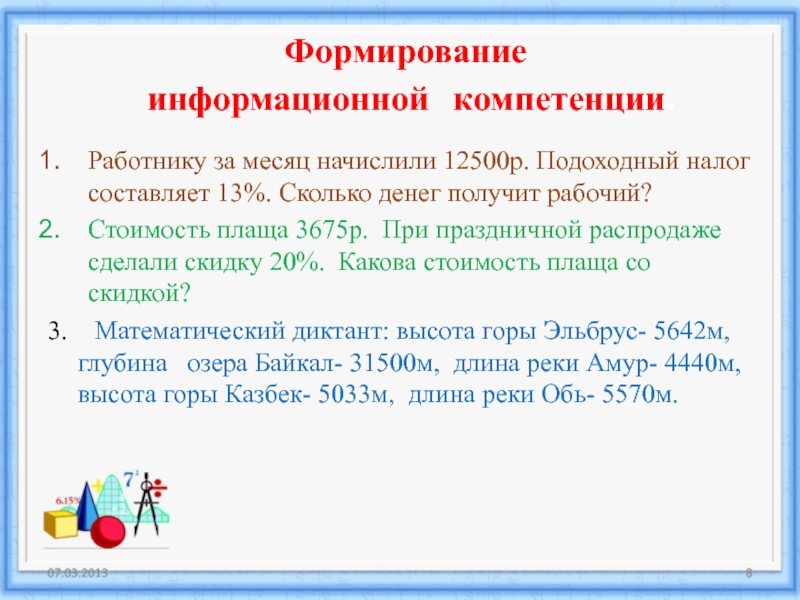 3. Математический диктант: высота горы Эльбрус- 5642м, глубина озера Байкал- 31500м, длина реки Амур- 4440м, высота горы Казбек- 5033м, длина реки Обь- 5570м.