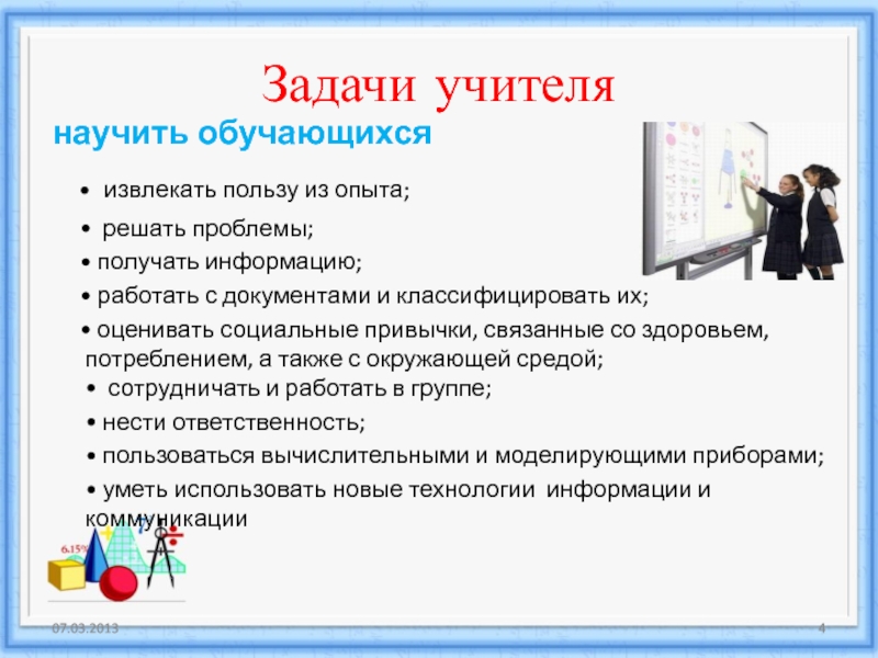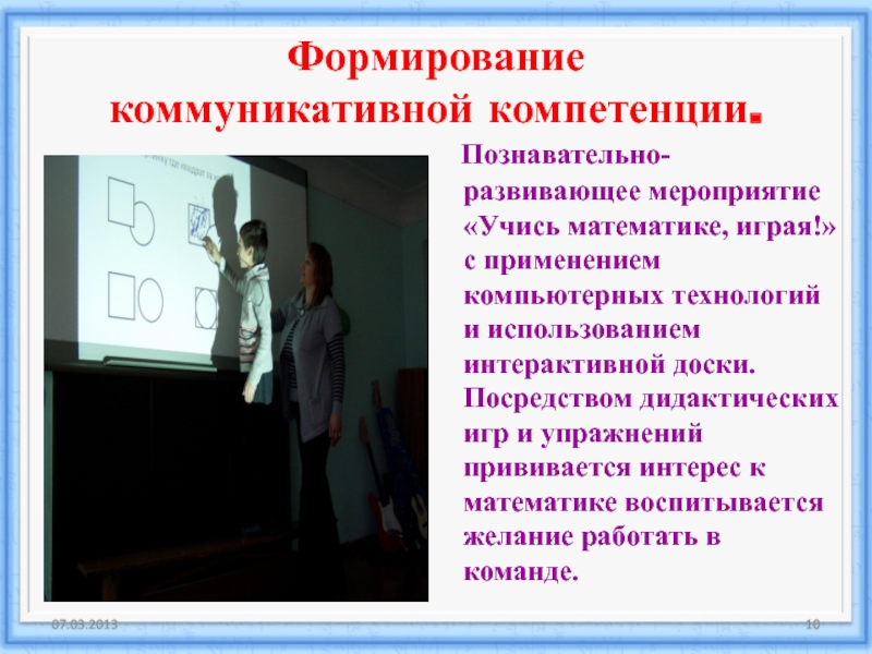 технологий и использованием интерактивной доски. Посредством дидактических игр и упражнений прививается интерес к математике воспитывается желание работать в команде.