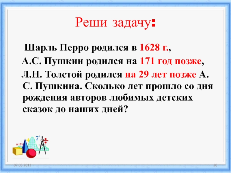 Л.Н. Толстой родился на 29 лет позже А.С. Пушкина. Сколько лет прошло со дня рождения авторов любимых детских сказок до наших дней?