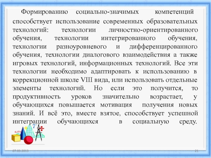 Слайд 21 Формированию социально-значимых компетенций способствует использование современных образовательных технологий: технологии личностно-ориентированного