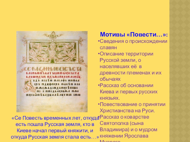 «Се Повесть временных лет, откуда есть пошла Русская земля, кто в Киеве начал первый княжити, и откуда Русская земля стала есть…»
