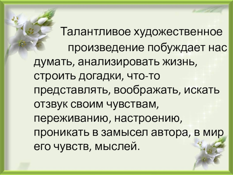 произведение побуждает нас думать, анализировать жизнь, строить догадки, что-то представлять, воображать, искать отзвук своим чувствам, переживанию, настроению, проникать в замысел автора, в мир его чувств, мыслей.
