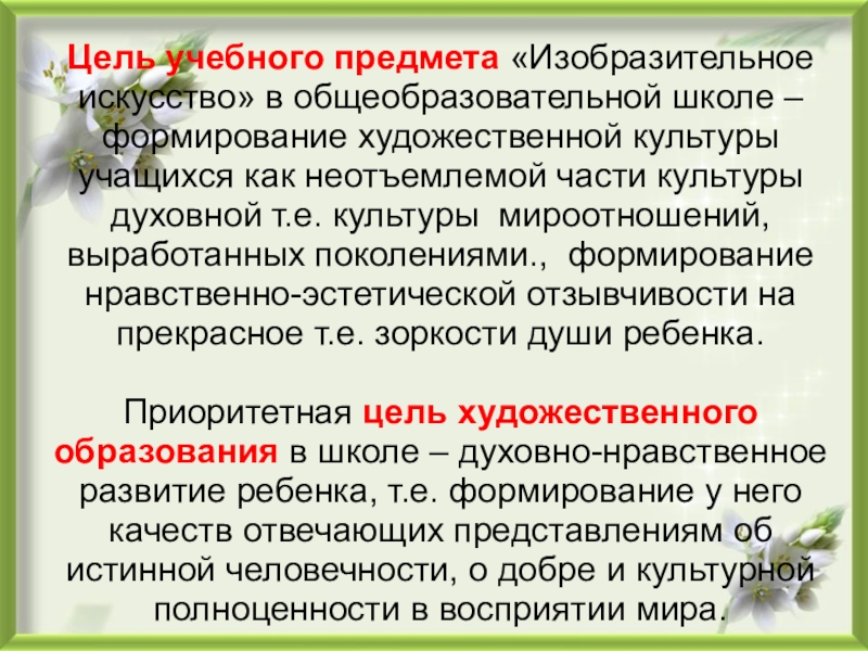 Приоритетная цель художественного образования в школе – духовно-нравственное развитие ребенка, т.е. формирование у него качеств отвечающих представлениям об истинной человечности, о добре и культурной полноценности в восприятии мира.